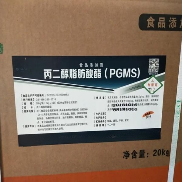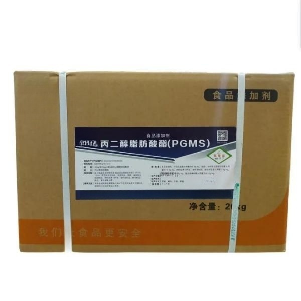 Propylene glycol fatty acid ester is obtained by esterification of fatty acid and 1,2-propylene glycol. The obtained product is a mixture of monoester and diester, which can be obtained by molecular distillation. Propylene glycol fatty acid ester has good foaming and emulsifying properties, and its foaming ability depends on the content of monoester. The higher the content of monoester, the better the properties. It is often used as foaming agent for cakes and cream cakes, and it is also often used in conjunction with mono-and di-fatty glycerides to play a synergistic role.